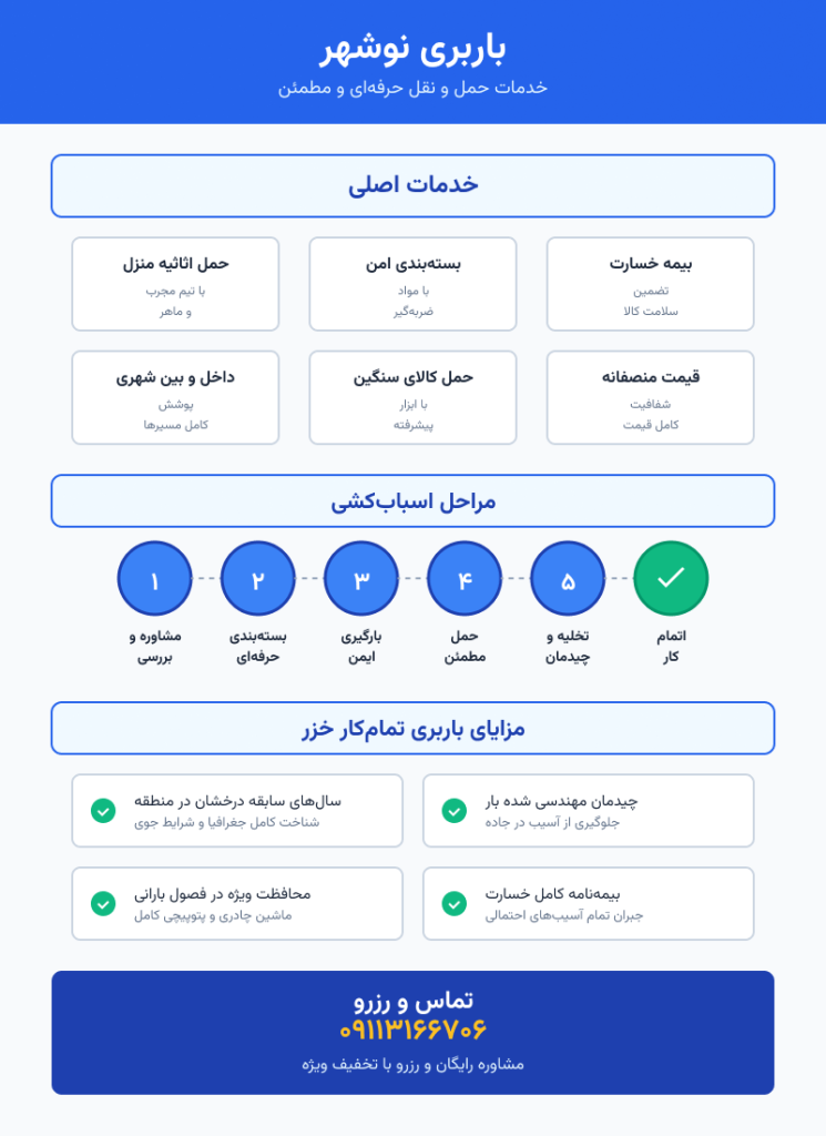 هزینه باربری به نوشهر به عواملی مثل نوع ماشین، تعداد کارگر و مسافت بستگی دارد. ما شفافیت قیمت را تضمین می کنیم. برای دریافت مشاوره رایگان و رزرو با تخفیف ویژه، همین حالا با شماره 09113166706 تماس بگیرید یا به صفحه «دریافت مشاوره حمل بار و اثاثیه» مراجعه کنید.